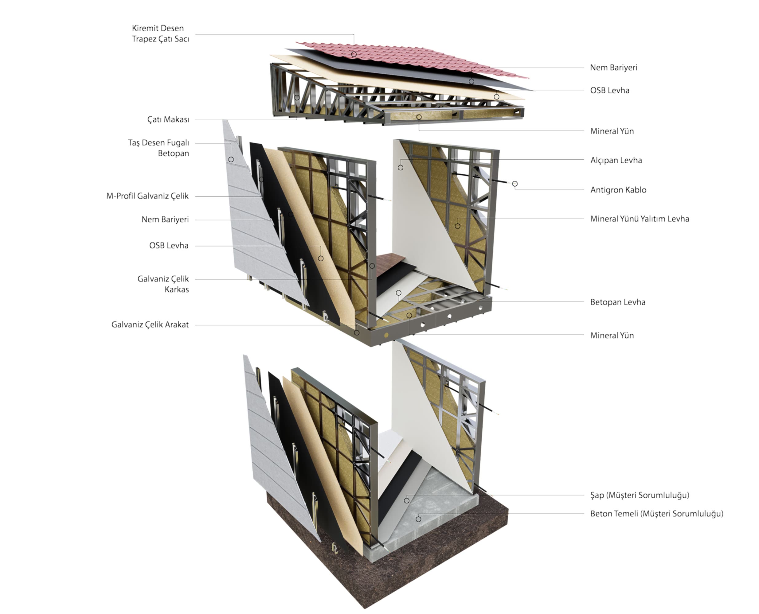 | DIŞ DUVAR TOPLAM KALINLIĞI | Alçıpan + Hafif Çelik Karkas + Osb + Nem Bariyeri + M profil + Ders betopanı + Kaplama betopanı 150 mm dir | |