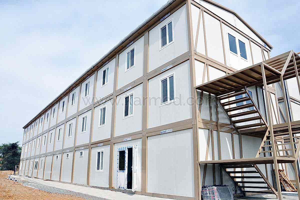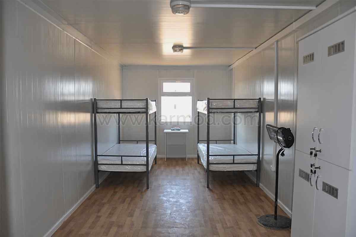 Karmod Prefabrik Yapı Teknolojileri olarak farklı alanlar için 2,4x6 ya da 3x7 ölçülerinde standart üretim sahip yatakhane konteyner ile özel ölçeklendirilebilen birleşimli yatakhane konteyner modeli üretmekteyiz. Kişi güvenliğine öncelik vererek ürünlerimizi kaliteli malzemelerden imal etmekteyiz. Değişen iklim koşullarına, sıcağa ve soğuya dayanıklı ürünler yapmaktayız. Dilerseniz yatakhaneye çatı opsiyonu ekleyebiliriz. Konteyner yatakhane birkaç kez sökülerek tekrar montaj edilebilir. Bu özelliği sayesinde bulunduğu yerden başka yerlere taşımak son derece kolaydır. Estetik görünüme sahip olması için dış ve iç dekorasyonda değişiklikler yapılabilir.