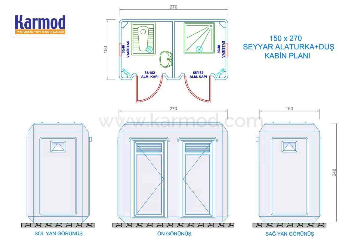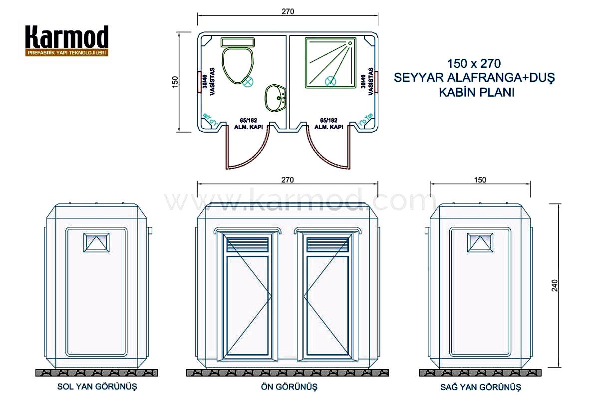 Tekli üniteden 7’li üniteye varana kadar alternatif kabin sayısında seyyar tuvalet ve duş planları bulunmaktadır. Seyyar alafranga tuvalet planının yanı sıra yer taşı alaturka ve duş kabini şeklinde üniteler hazırlanmaktadır. Ünitelerin seçimi müşteri tercihine bırakılmıştır. Seyyar tuvalet ve duş planlarında kullanım ergonomisi ön planda tutulmuştur.